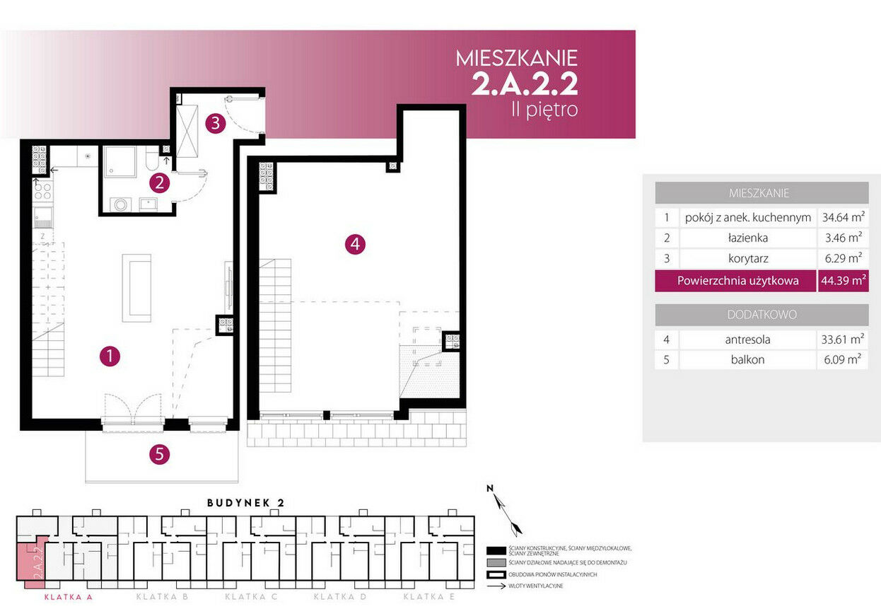 Kompleks składa się z pięciu nowoczesnych budynków, oferujących mieszkania o różnorodnych powierzchniach, od 37 m² do 103 m². W ofercie znajdują się funkcjonalne mieszkania dwupokojowe, przestronne trzypokojowe lokale oraz eleganckie czteropokojowe apartamenty. Dla osób poszukujących większej przestrzeni proponujemy także mieszkania dwupoziomowe z antresolą, które mają powierzchnię od 15 m² do 36 m². Każde mieszkanie w kompleksie ma dostęp do prywatnej przestrzeni zewnętrznej — balkonów lub ogrodów, idealnych do relaksu i spędzania czasu na świeżym powietrzu. Ogrody, przynależące do lokali na parterze, będą miały powierzchnię od 7 m² do 56 m², oferując mieszkańcom możliwość stworzenia wyjątkowej strefy wypoczynku w otoczeniu natury.Prezentowane mieszkanie typu "Open space" ma powierzchnię 78m2 i znajduje się na drugim piętrze w czterokondygnacyjm budynku a jego główne cechy to- ogromny , przestronny salon z aneksem kuchennym o powierzchni 34,36m2 z wyjściem na balkon o powierzchni 6,06 m2,na pierwszym poziomie istnieje możliwość aranżacji dodatkowego pokoju, łazienka o powierzchni 3,46m2, przedpokój o powierzchni 6,26m2, antresola o powierzchni 33,61m2 na której możemy zaaranżować dwie sypialnie i dodatkową łazienkę (przyłącza są już wyprowadzone). Dodatkowym atutem mieszkania z antresolą jest fakt, że do opłat czynszowych nie jest wliczana powierzchnia antresoli, a więc płacimy tylko za powierzchnię pierwszego poziomu to jest powierzchnia 44,39m2 a korzystamy z powierzchni aż 78m2!