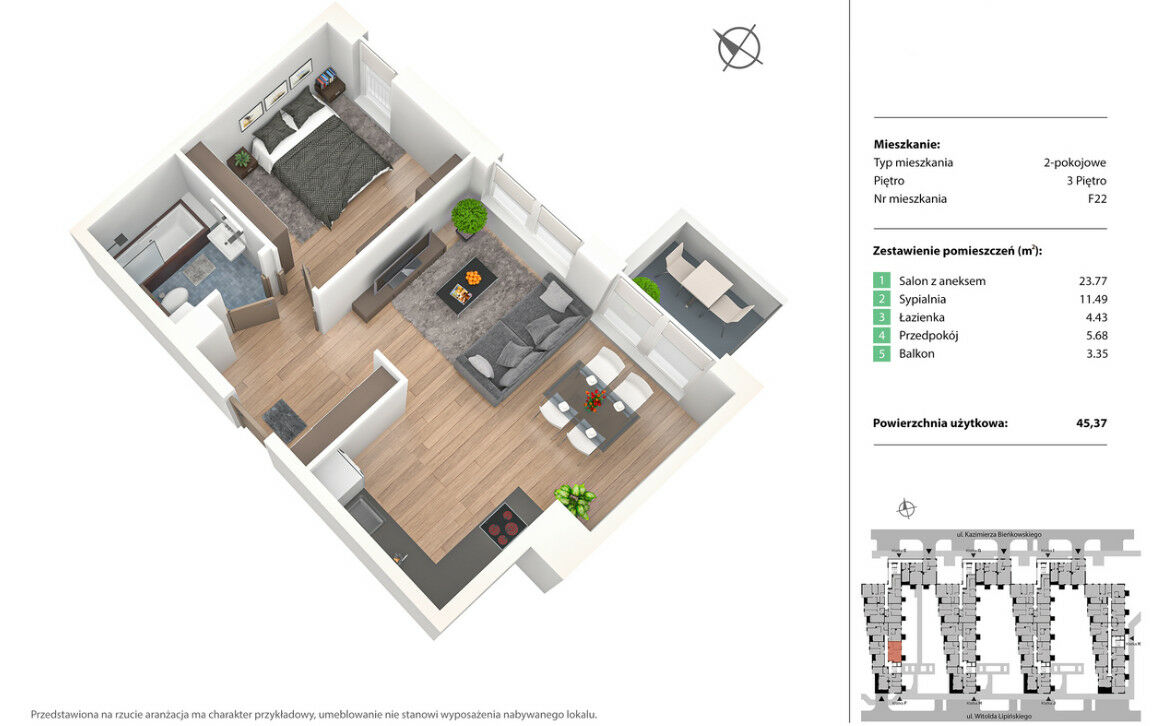 Prezentowane mieszkanie ma powierzchnię 45,37m2 i znajduje się na trzecim piętrze w czterokondygnacyjnym budynku a jego główne cechy to- salon z aneksem kuchennym o powierzchni 23,77m2 z wyjściem na balkon o powierzchni 3,35m2,sypialnia o powierzchni 11,49m2, łazienka o powierzchni 4,43m2, przedpokój o powierzchni 5,68m2.