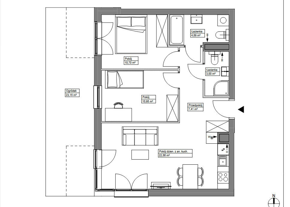 Prezentowane mieszkanie ma powierzchnię 59,51m2 i znajduje się na parterze w 5 piętrowym budynku a jego główne cechy to- salon z aneksem kuchennym o powierzchni 22,56m2 z wyjściem na ogród o powierzchni 23,15m2, 2 sypialni o powierzchniach 10,95m2 i 10,70m2 oraz 2 łazienki o powierzchniach 4,89m2 i 3m2.