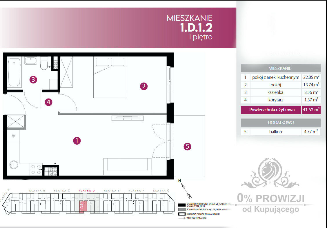 Prezentowane mieszkanie ma powierzchnię 41,52m2 i znajduje się na pierwszym piętrze w czterokondygnacyjnego budynku a jego główne cechy to- salon z aneksem kuchennym o powierzchni 22,85m2 z wyjściem na balkon o powierzchni 4,77m,sypialnia o powierzchni 13,74m2, łazienka o powierzchni 3,56 m2, przedpokój o powierzchni 1,37m2.