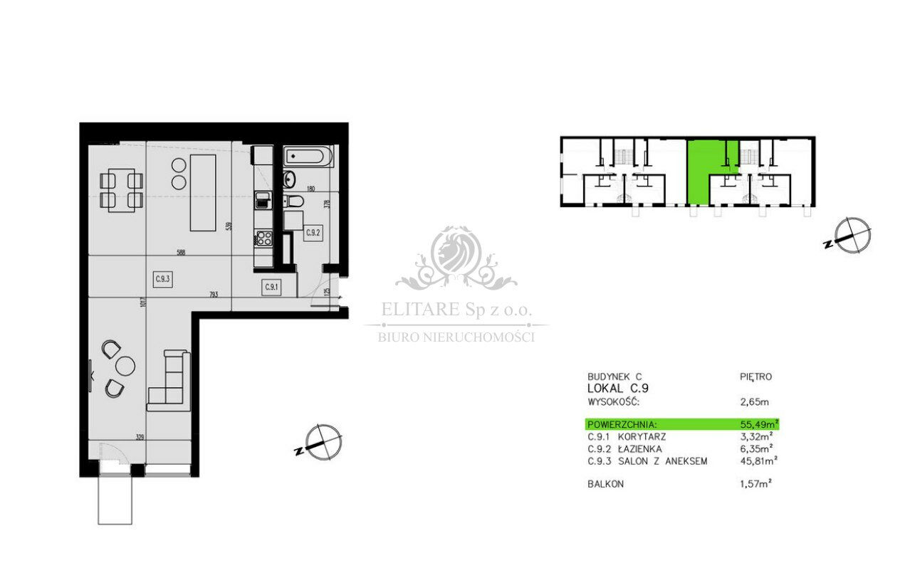 Mieszkanie położone jest na 1 piętrze w 3 kondygnacyjnym budynku. Powierzchnia mieszkania to 55,49m2, na którą składa się ogromny salon z kuchnią w aneksie o pow. 45,81m2, łazienka o powierzchni 6,35m2, oraz korytarz o pow. 3,32m2 z miejscem na szafę w zabudowie. Ekspozycja okien południowa.