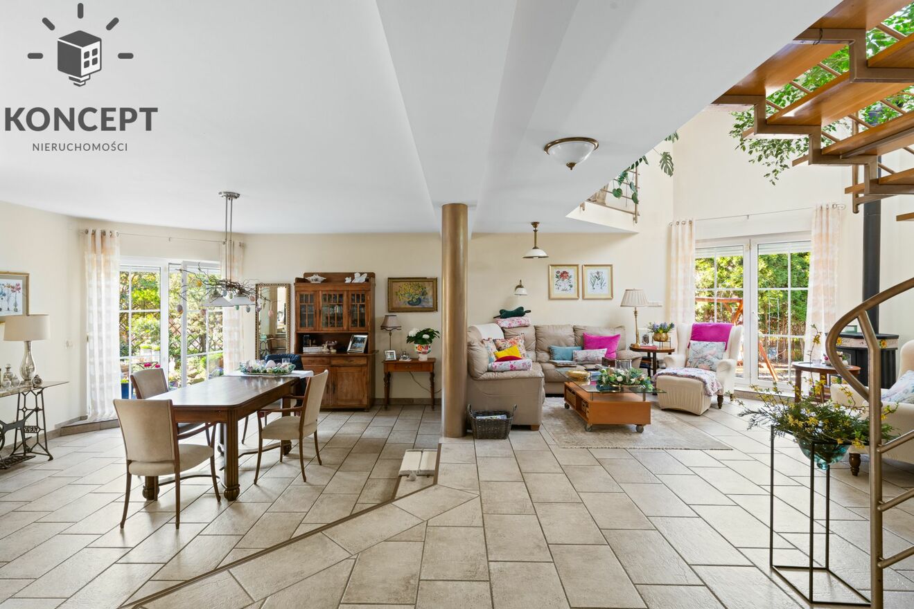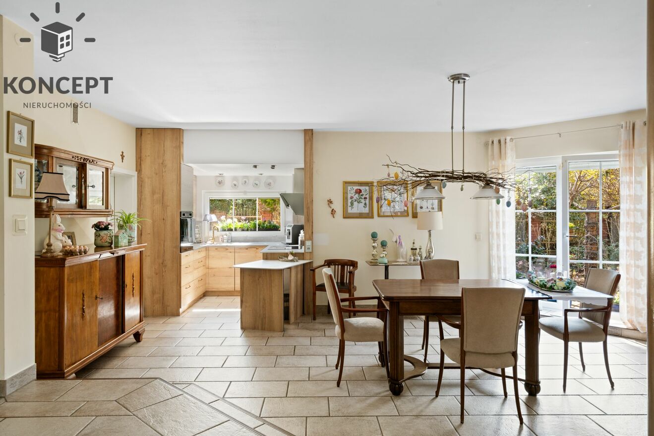 - Imponujący Open Space: Jadalnia z jasną kuchnią i wyjściem na ogród od frontu oraz przestronny salon z wyjściem na zadaszony taras z tyłu.