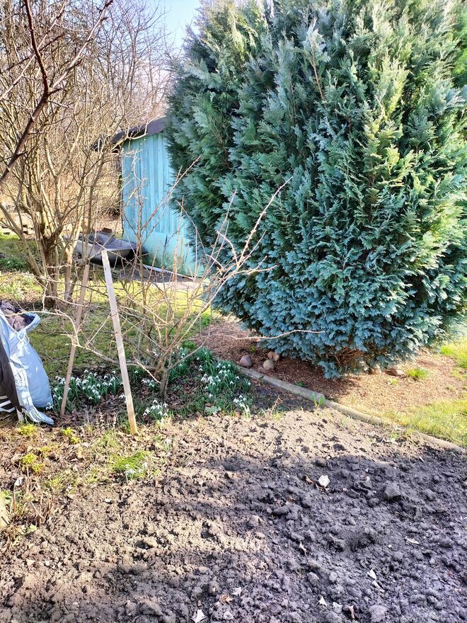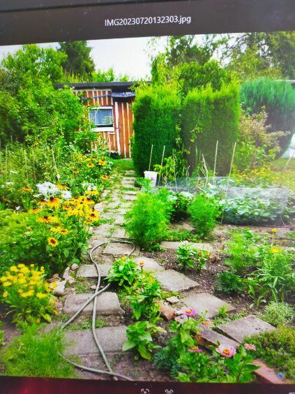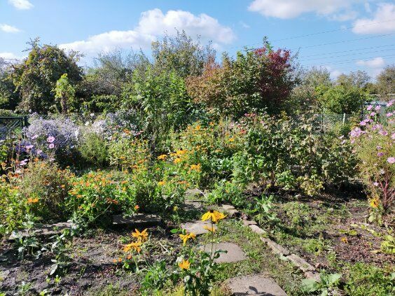 Działka zadbana i na dzialce sa nasadzenia ; kwiaty, drzewa, krzewy ( winogron ) i inne.