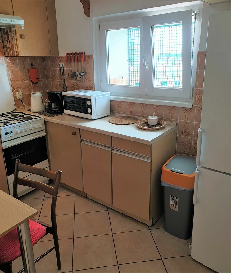 • Kuchnia: lodówka z zamrażarką, kuchenka gazowa, mikrofalówka, czajnik elektryczny, ekspres przelewowy, okap oraz pełne wyposażenie kuchenne (garnki, patelnie, talerze, sztućce, kubki).