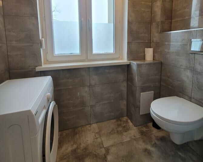 Łazienka: lustro, szafka z umywalką, pralka, toaleta, kabina