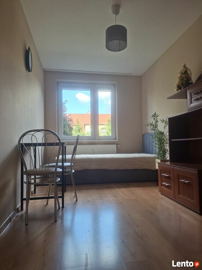 Dzielnica Gaj - oddzielny i zamykany na klucz pokój jednoosobowy, w mieszkaniu 3-pokojowym, zamieszkiwanym przez jedną osobę (kobieta), oraz kota. Pokój wyłącznie dla Kobiety pracującej lub studiującej i pracującej i niepalącej. Pokój został świeżo odmalowany. Jest wyposażony w nowe łóżko, regał z szafą, nowy stolik i 2 krzesła, nową lampę. W oknach rolety. Internet w cenie. W mieszkaniu do wspólnego użytku kuchnia (duża lodówka, zmywarka, kuchenka elektryczna, piekarnik), łazienka z pralką, WC osobne. Możliwość korzystania z 30-sto metrowej werandy. Dostęp do internetu (Wi-Fi). W pobliżu sklepy Biedronka, Kaufland, Ferio Gaj, dwie Hale Targowe i kilka bazarów ze sklepami. Blisko do autobusów 136, 145, 146, K. Tramwaj 31. Cena wynajmu jest bez dodatkowych opłat za media.Sprawdź zainteresowanie tym ogłoszeniem