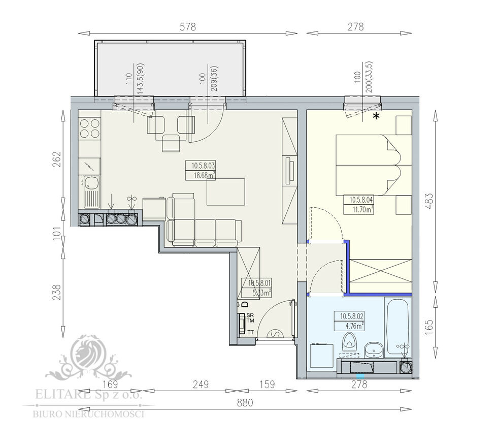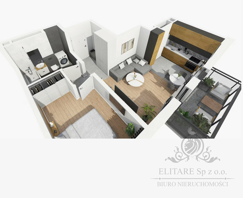 Mieszkanie 2 pokojowego z balkonem o powierzchni 40,47m2 . Mieszkanie znajduje się na 5 piętrze w 8 piętrowym apartamentowcu z windą z poziomu garaży. Główna część mieszkania stanowi salon o pow. 18,68m2 z kuchnią w aneksie, z salonu wyjście na balkon 5,38m2, w mieszkaniu jest drugi pokój-oddzielna sypialnia o pow. 11,70m2, łazienka z toaletą o pow. 4,76m2 i przedpokój z miejscem na szafę w zabudowie. Ekspozycja okien zachodnia, mieszkanie jednostronne z widokiem z balkonu na zielony taras i niską sąsiednią zabudowę i zielony teren okalający osiedle. Wysokość mieszkania 2,57m. Wszystkie media miejskie włącznie z ogrzewaniem, w mieszkaniach na wyposażeniu w cenie mamy również się bezrzędowy systemem zarządzania inteligentnym domem!, w budynku znajdziemy m.in.: dostęp do części wspólnych za pomocą aplikacji w smartfonie, czy zamykane rowerownie. O bezpieczeństwo osiedla zadba całodobowy monitoring wokół budynku i w hali garażowej.Do mieszkania można dokupić miejsce postojowe w garażu podziemnym oraz komórkę lokatorską (zakup nieobowiązkowy).