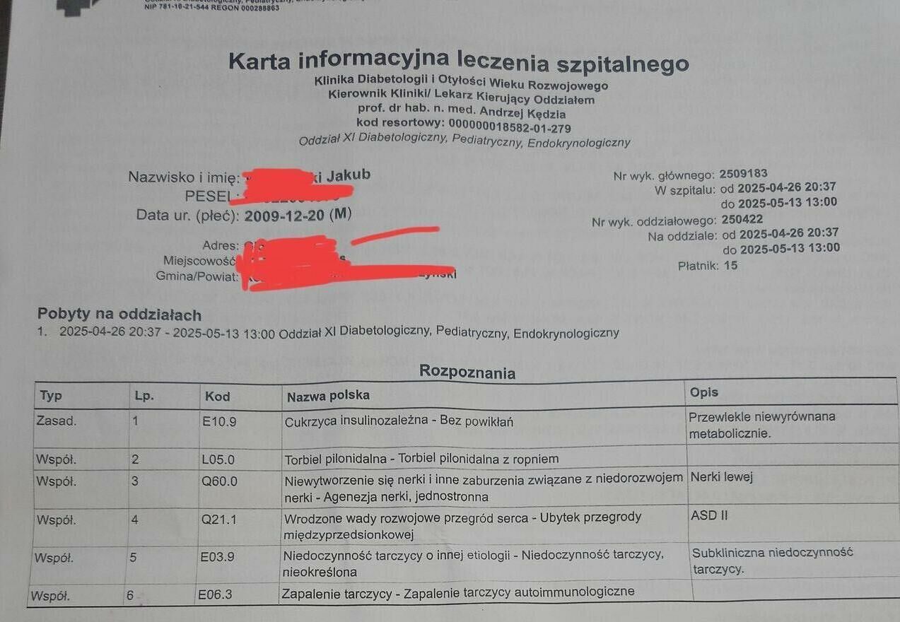 Jakub ma m.in. ASD, agenezję lewej nerki, niedoczynność tarczycy, cukrzycę typu 1, cytomegalię i torbiel pilonidalną.