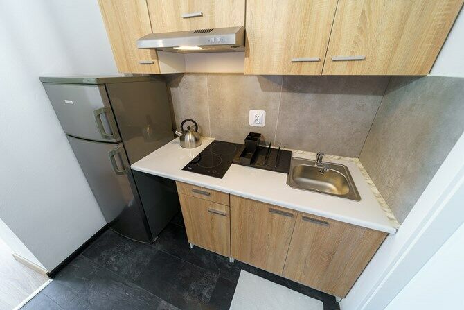 Kuchnia wyposażona w płytę elektryczną, dużą lodówkę, okap i