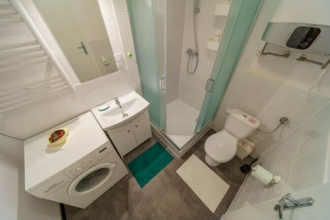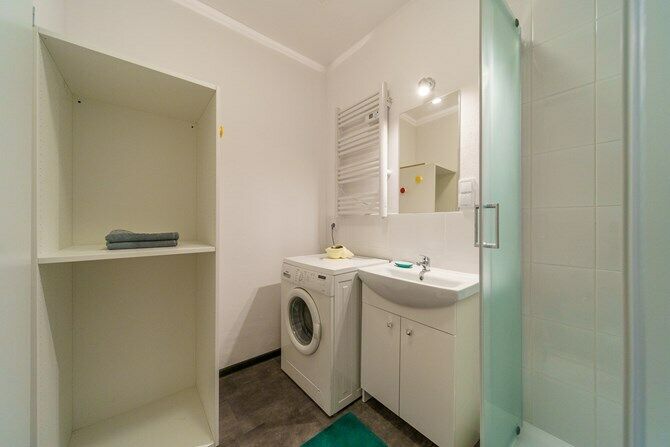 Łazienka: pralka, duża kabina prysznicowa, WC i regał.