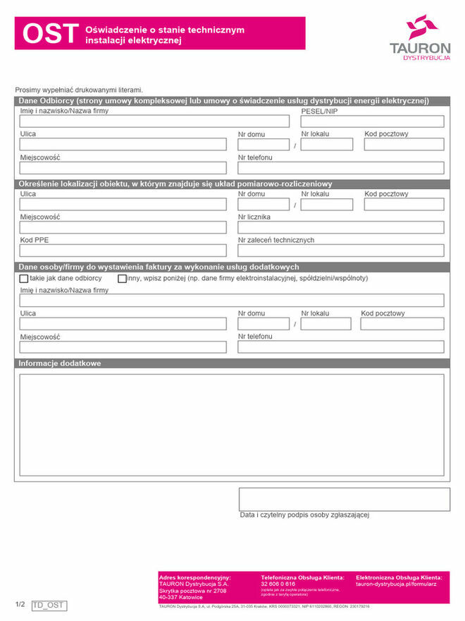 Wykonujemy przeglądy instalacji elektrycznej z oświadczeniem OST dla Taurona. Posiadamy uprawnienia elektryczne SEP kategorii E eksploatacji i D dozoru technicznego. Wszystkie protokoły podbijamy pieczątka z uprawnieniami.