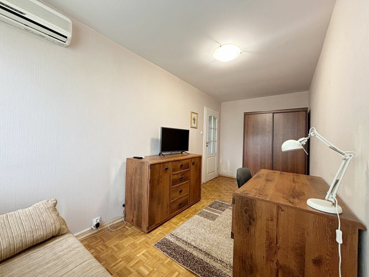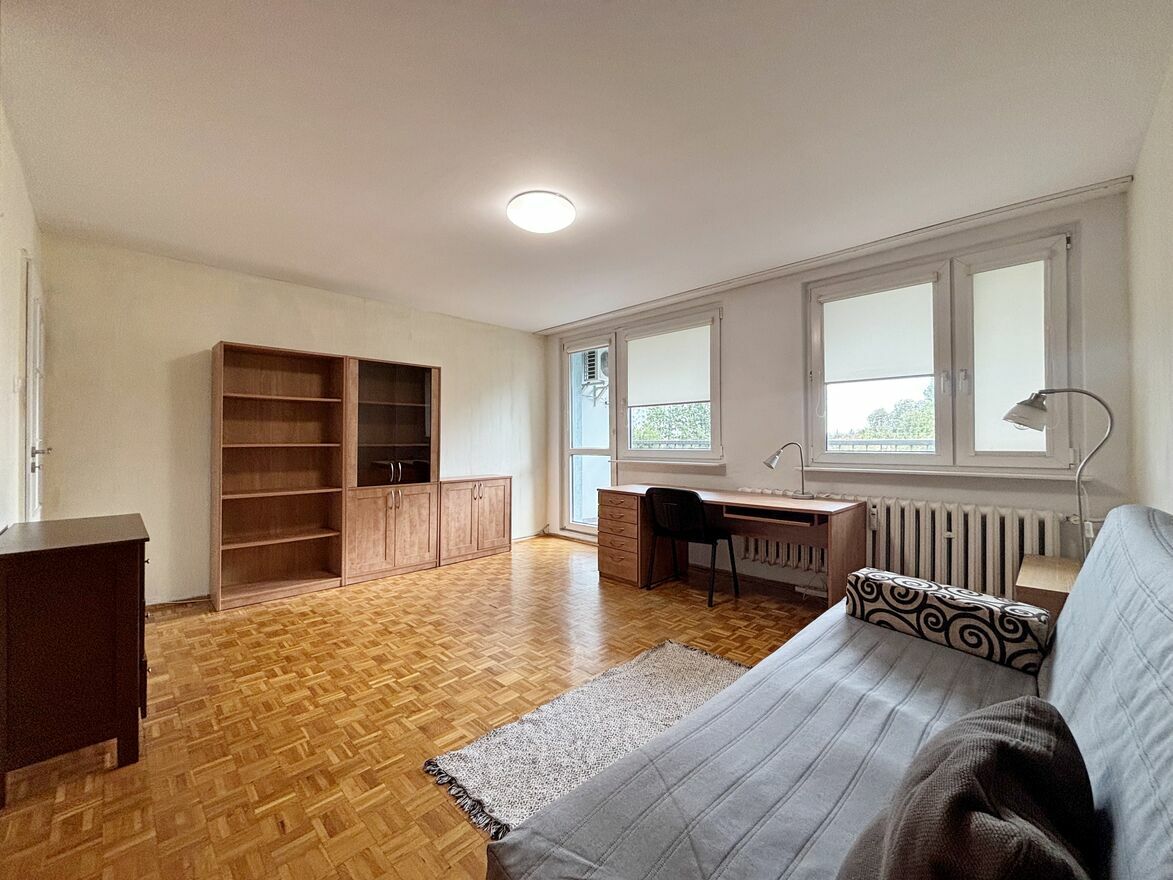 - pokoju o powierzchni 20 m2 z wyjściem na spory balkon (od strony patio z widokiem na zieleń), z pojemną zabudowaną szafą, meblościanką, biurkiem, rozkładanym łóżkiem,