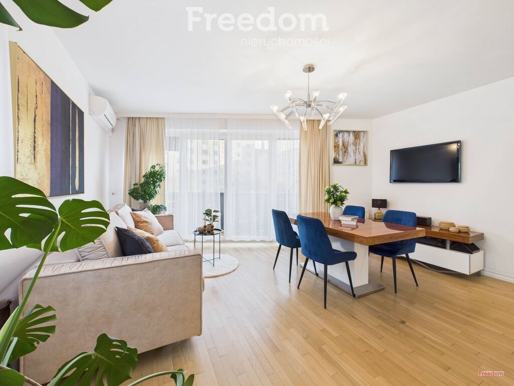 Jasny, przestronny salon z aneksem kuchennym oraz wyjściem na balkon.