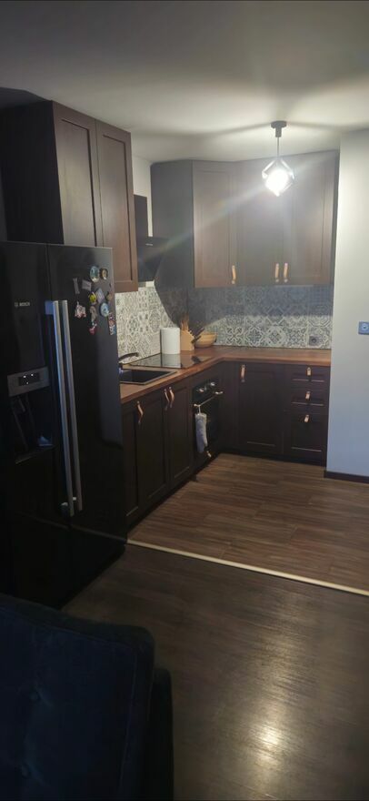 Aneks kuchenny zachwyca połączeniem elegancji i praktyczności. Został w pełni wyposażony w nowoczesny sprzęt AGD: dużą lodówkę dwudrzwiową, płytę indukcyjną, piekarnik oraz okap. Ciemne fronty mebli w połączeniu z delikatnym oświetleniem LED tworzą niezwykle efektowny klimat – idealny zarówno do gotowania, jak i spędzania czasu z bliskimi przy kieliszku wina.