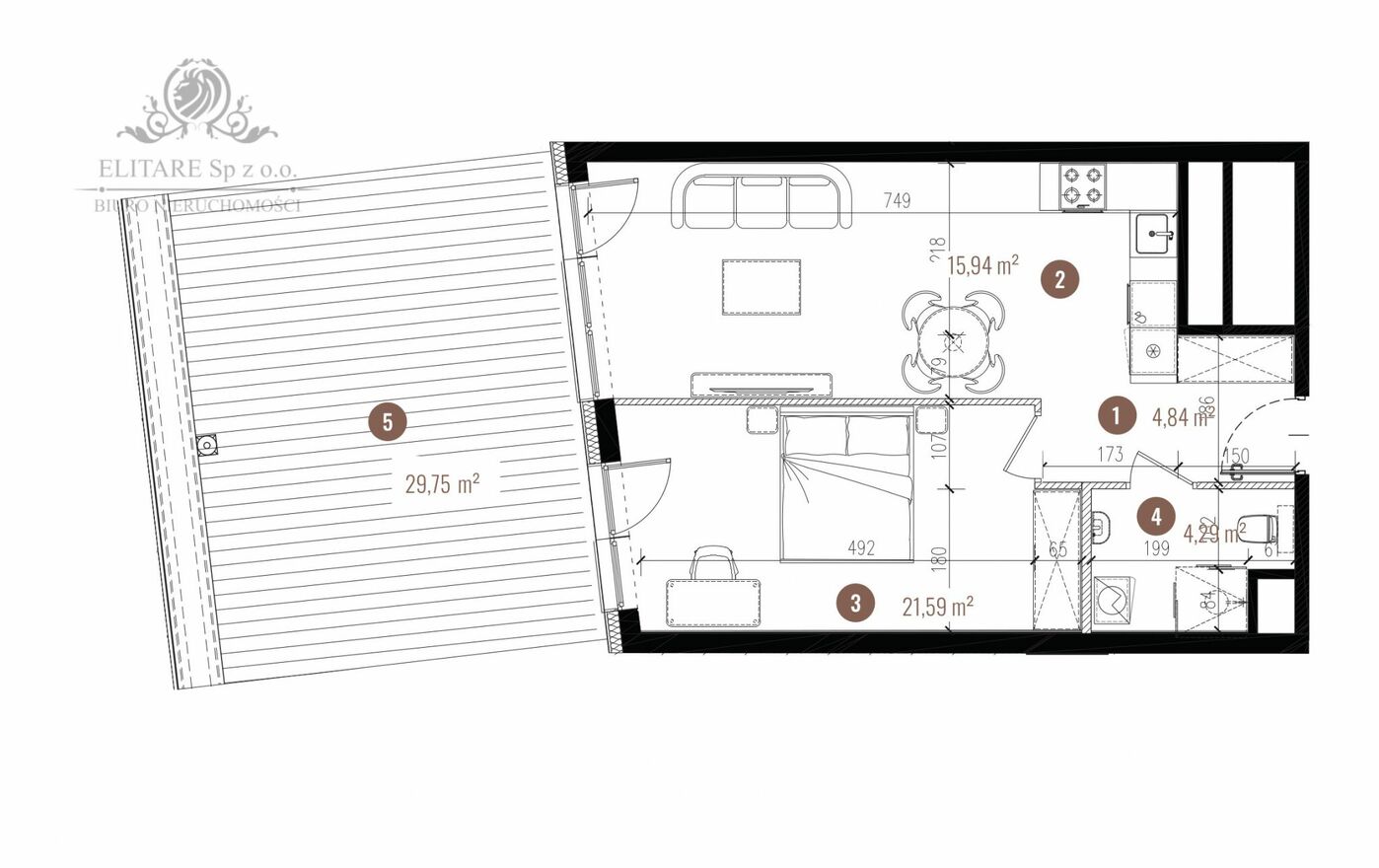– salon z jadalnią i kuchnią w aneksie o pow. 21,59m2 w salonie mamy wyjście na niesamowity taras o powierzchni aż 29,75m2,