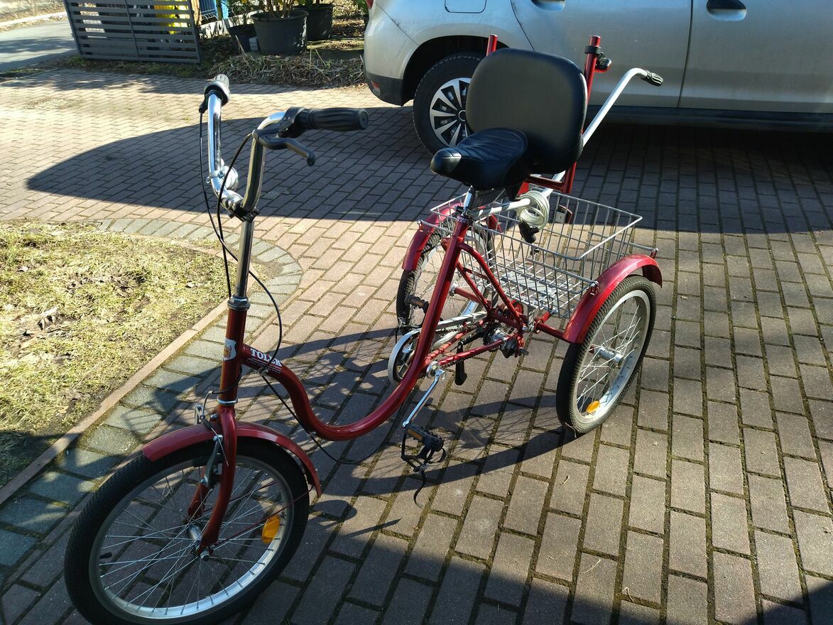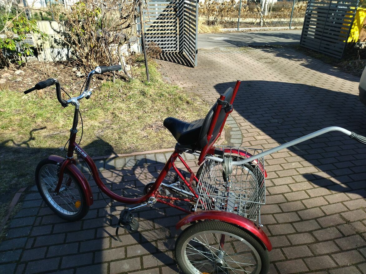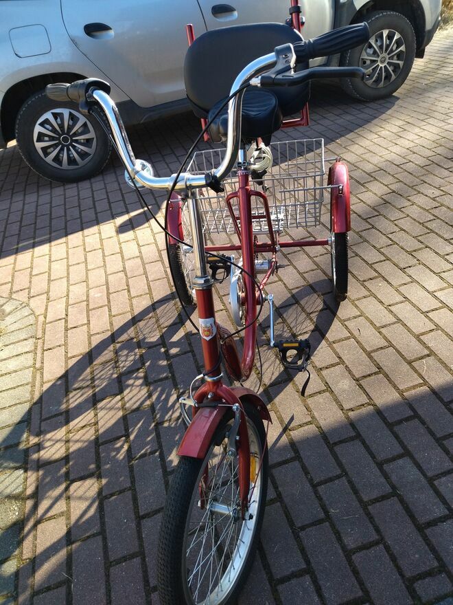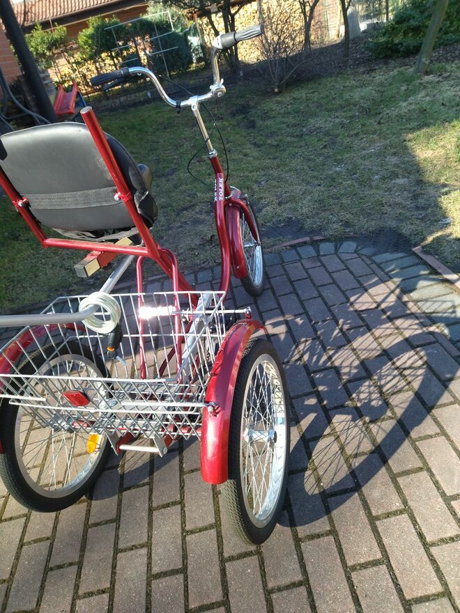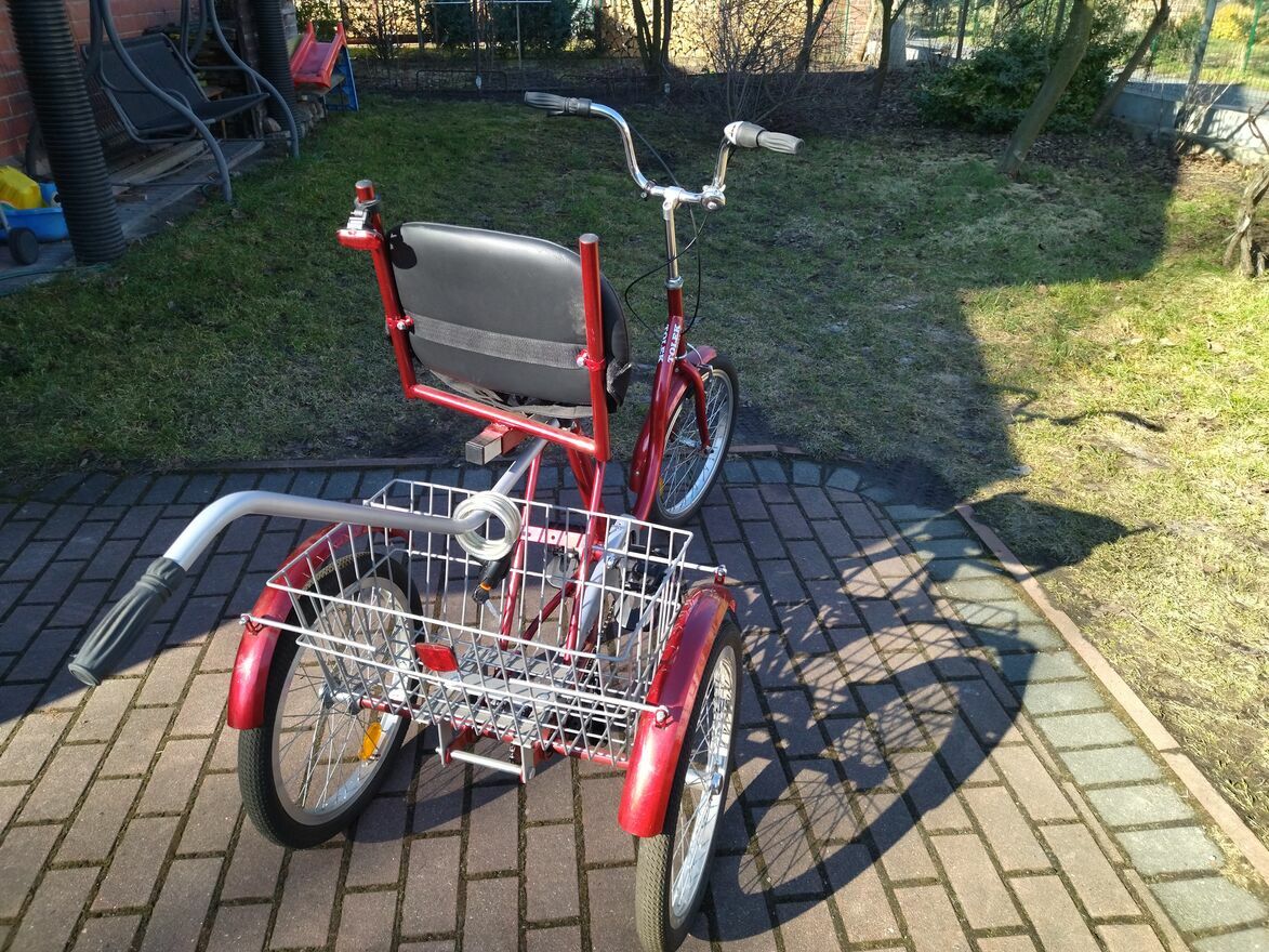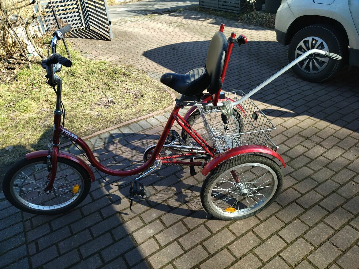 Nowy rower trójkołowy Tolek z dużym bagażnikiem i uchwytem tylnym do sterowania i inne akcesoria , nowy, nie używany , jazda próbna.Rower rehabilitacyjny , bezpieczny dla osób niepełnosprawnych .