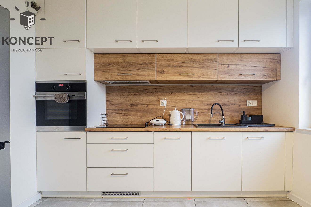Kuchnia: Nowoczesna i funkcjonalna, z licznymi szafkami, obszernym zlewozmywakiem i stołem jadalnianym z 4 krzesłami. Wyposażenie: lodówko-zamrażarka, zmywarka, okap, płyta indukcyjna, piekarnik, naczynia