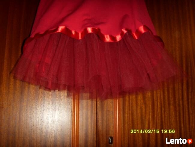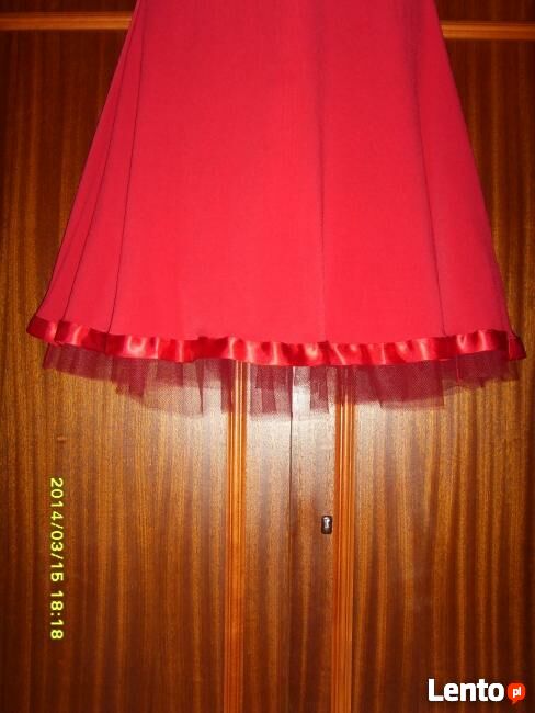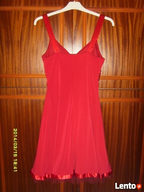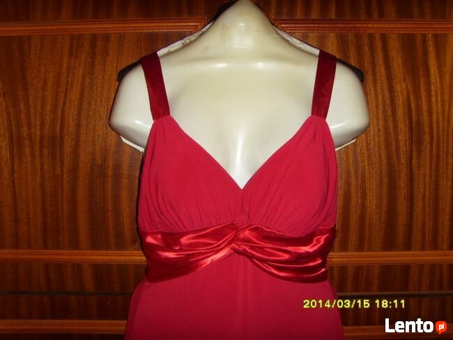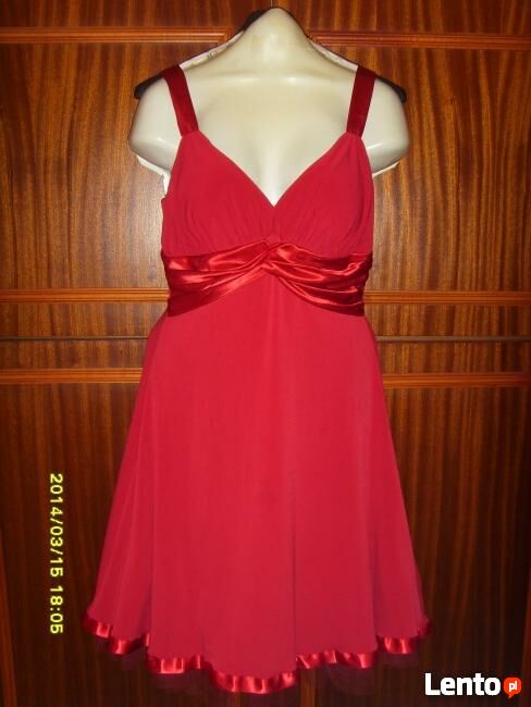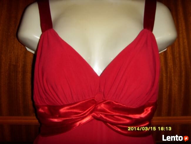 Mam do zaoferowania śliczną, ekskluzywną sukienkę firmy „Jessica”. Kolor intensywna czerwień. Sukienka jest lekko wcięta w tali i poszerzana do dołu. Na dole od wewnętrznej strony wszyta czerwona falbana z tiulu (na zdjęciach jest słabo widoczna). Pod biustem ozdobiona atłasowym przepasaniem. Ramiączka i dół sukienki wykończone atłasową lamówką. Sukienka założona tylko jeden raz przez co jest praktycznie nowa. Odbiór osobisty we Wrocławiu lub wysyłka za pośrednictwem Poczty Polskiej.MATERIAŁ: