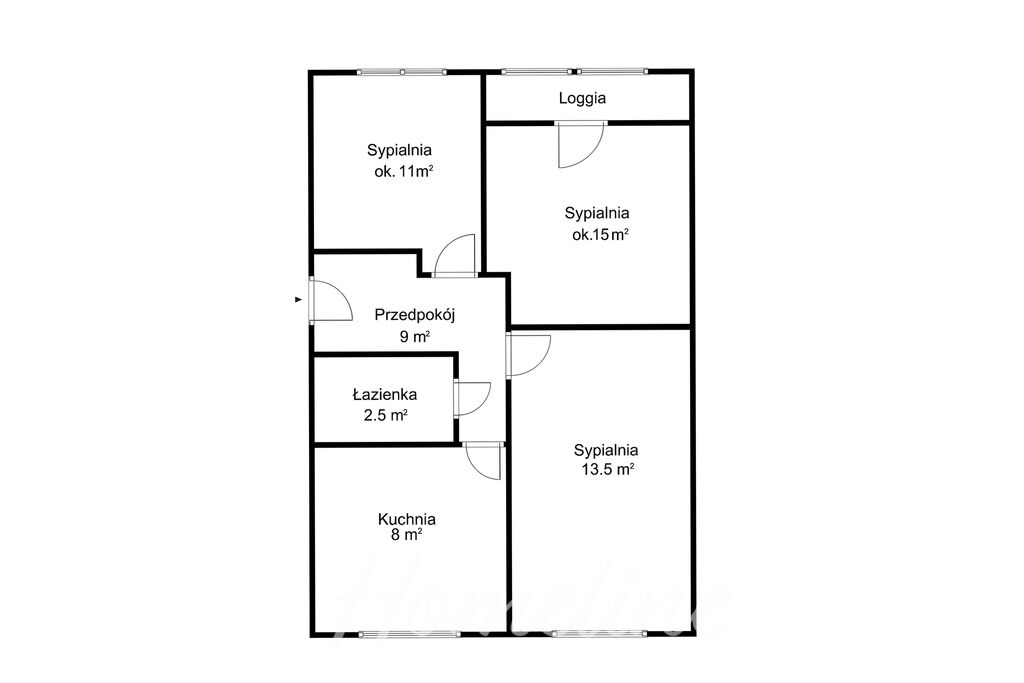 Salon – 15 m²Pokój – 13,5 m²Pokój – 11 m²Kuchnia – 8