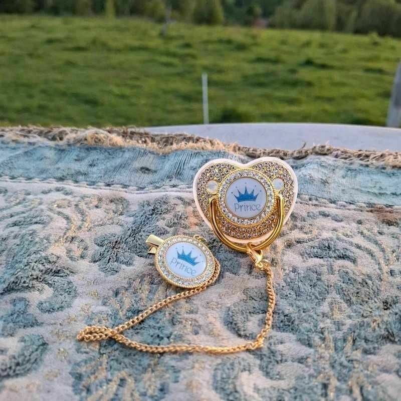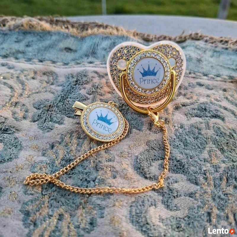 Ekskluzywny smoczek dla małego księcia Nowy, nigdy nieużywany, bez metki. W zestawie elegancki łańcuszek z klipsem, tworzący stylowy komplet. Kolor złoty i jasnoniebieski oraz błyszczące kryształki przyciągają uwagę i dodają blasku każdej stylizacji niemowlaka. Wykonany z bezpiecznego silikonu, odpowiedni dla dzieci od 0 do 12 miesięcy. Motyw „Prince” z koroną czyni go idealnym dodatkiem na prezent, baby shower, wyprawkę czy sesję zdjęciowąhttps://www.olx.pl/d/oferta/smoczek-z-korona-prince-idealny-na-prezent-CID88-ID16FNVJ.html