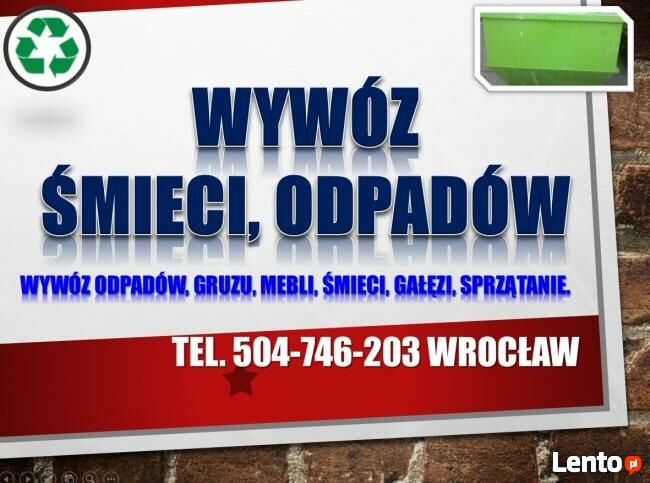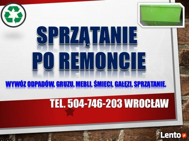 Sprzątanie placu budowy cennik tel. 504 - pokaż numer telefonu - , uporządkowanie terenu, po prowadzonych pracach budowlanych. Wywóz gruzu po remoncie ze zniesieniem do kontenera. Posprzątanie terenu, odbiór śmieci, folii, resztek materiałów budowlanych.Usługi wywozu nieczystości stałych, śmieci, gruzu, odpadów budowlanych, odpadów wielkogabarytowych, ziemi, gałęzi, liści. Ceny usługi do uzgodnienia. Wrocław.