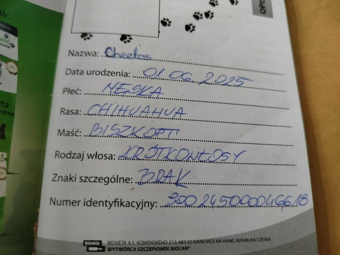 - Dodatkowo:Książeczka zdrowia, Odrobaczenia, Wyprawka, Czip