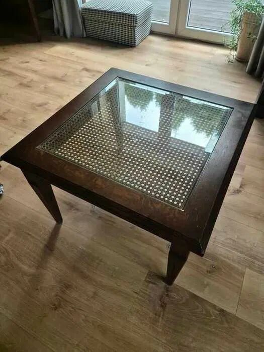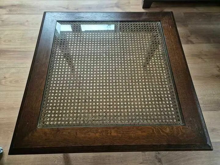 Elegancki stolik kawowy wykonany z litego dębu.Blat uzupełniony piękną, wiedeńską plecionką oraz szybą.