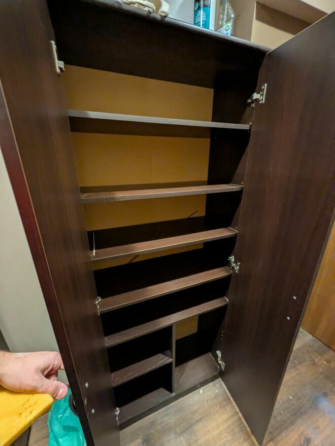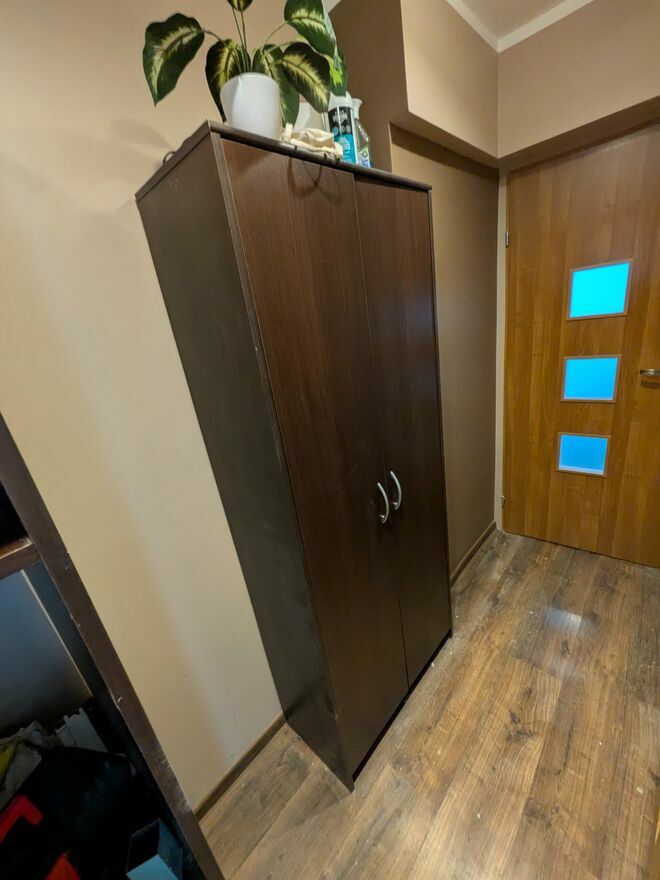 Praktyczna szafa korytarzowa w ciemnym kolorze, z pojemnymi półkami do przechowywania różnych przedmiotów. Mebel w dobrym stanie, może być przydatny do uporządkowania przestrzeni w korytarzu lub innym pomieszczeniu.Jakub