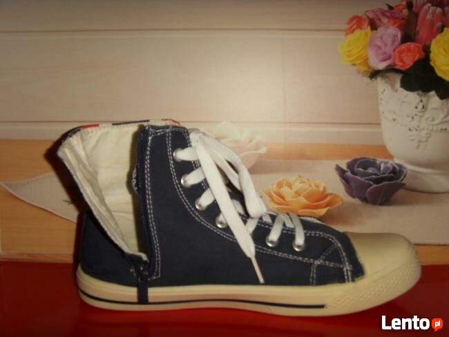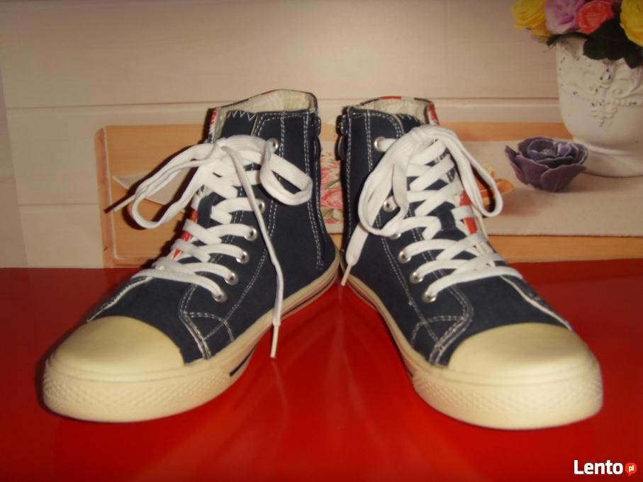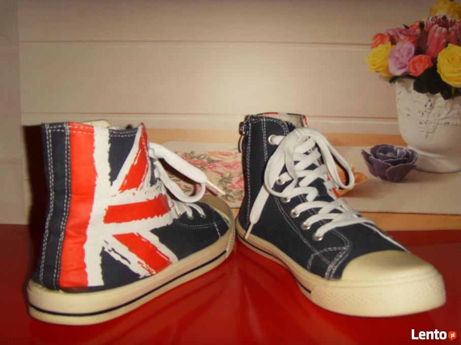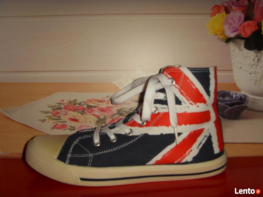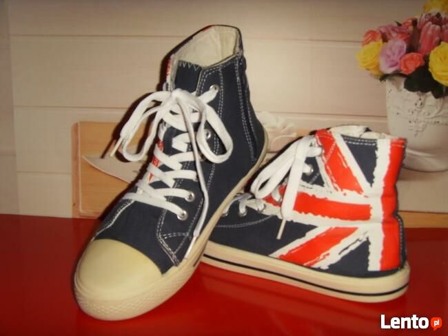 Oferuję bardzo fajne trampki z nadrukiem angielskiej flagi.- kolor granatowy, flaga w kolorach czerwonego i białego
