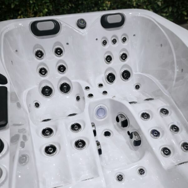 Przemyślany układ wnętrza pozwala na komfortowy relaks w pozycji leżącej oraz siedzącej. Dwie pełnowymiarowe leżanki zapewniają masaż całego ciała – od karku po stopy – natomiast siedzisko umożliwia klasyczny hydromasaż pleców.
