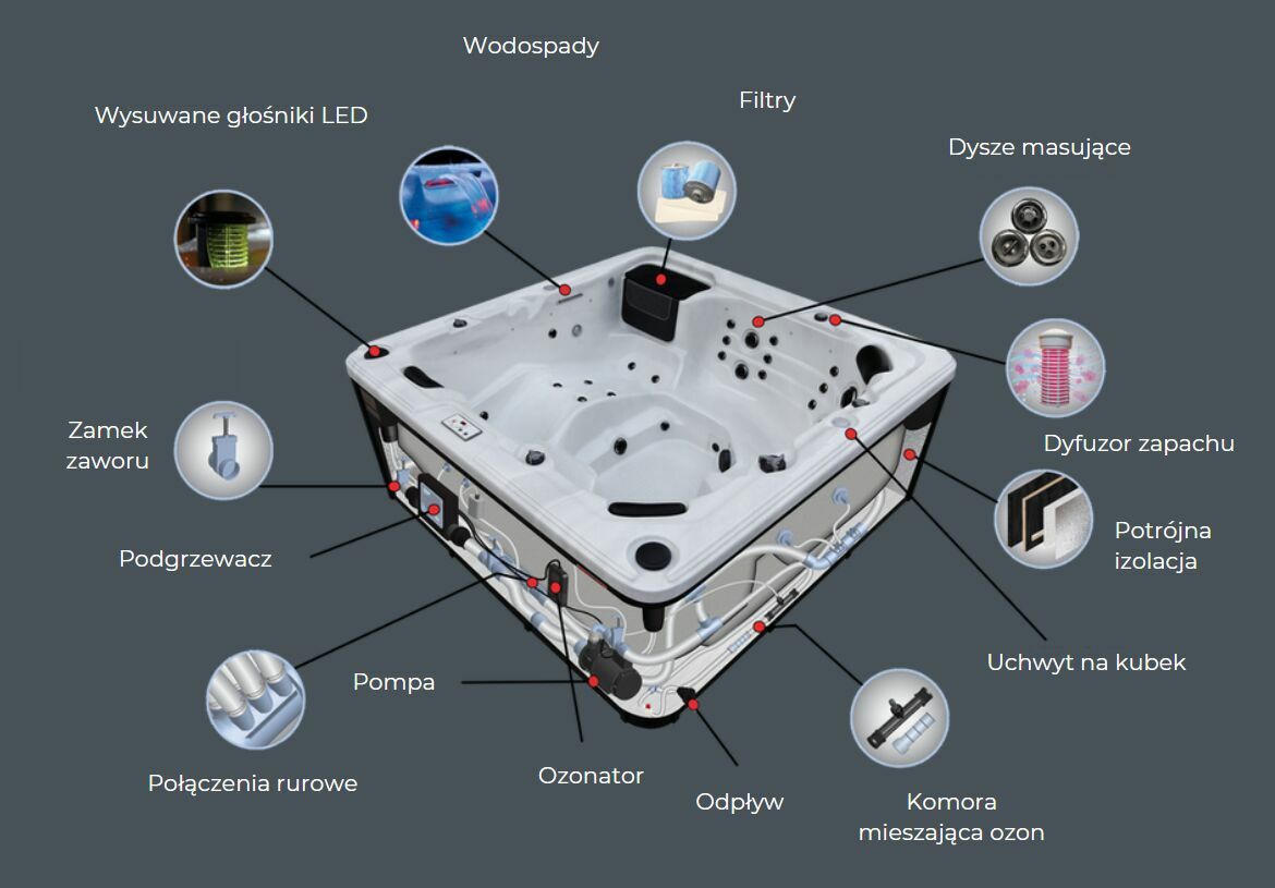 To kompaktowe, a zarazem niezwykle funkcjonalne jacuzzi oferuje pełnowymiarowy hydromasaż, aromaterapię, system audio Bluetooth oraz wydajną izolację przystosowaną do europejskich warunków klimatycznych.