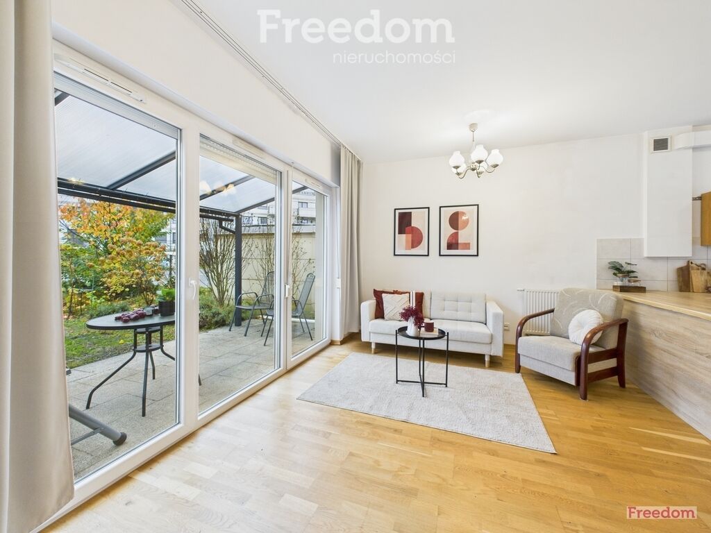 salon z aneksem kuchennym i wyjściem do ogrodu