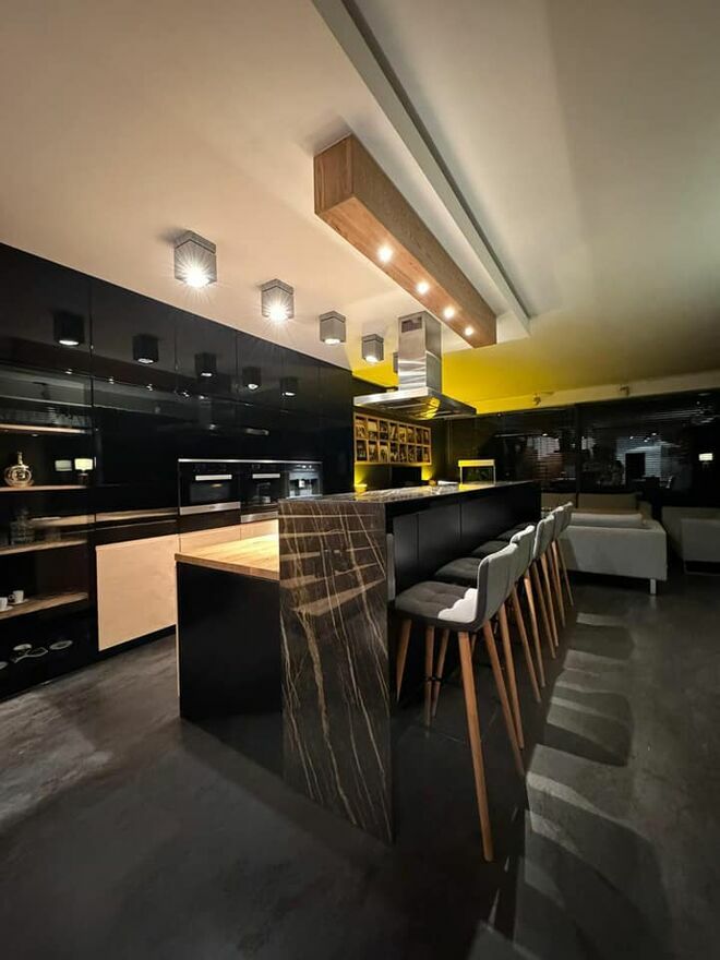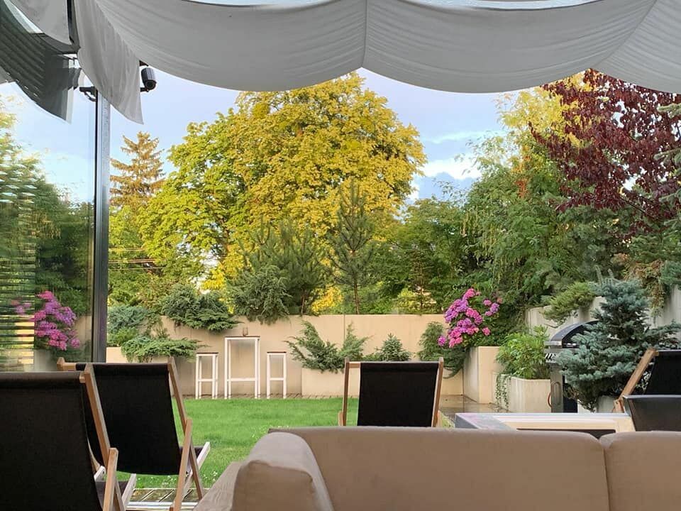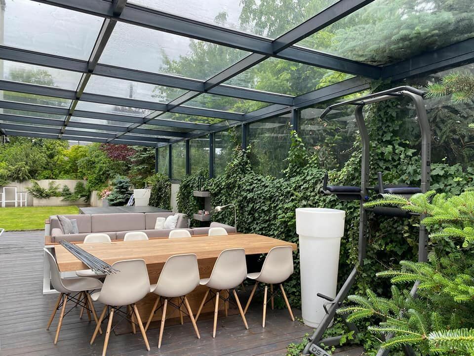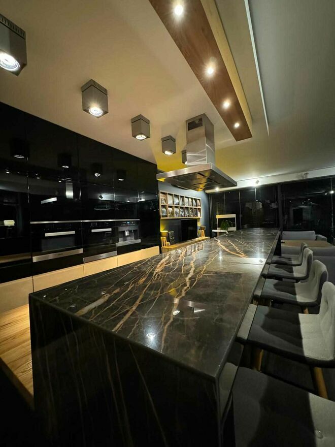 Przestronna część dzienna posiada dostęp do zagospodarowanej części zewnętrznej z zadaszoną strefą wypoczynkową wyposażoną w komfortowe meble oraz zewnętrzne jacuzzi. Powierzchnia salonu wraz ze szklaną oranżerią po otwarciu drzwi przesuwnych posiada pow. 150m2.