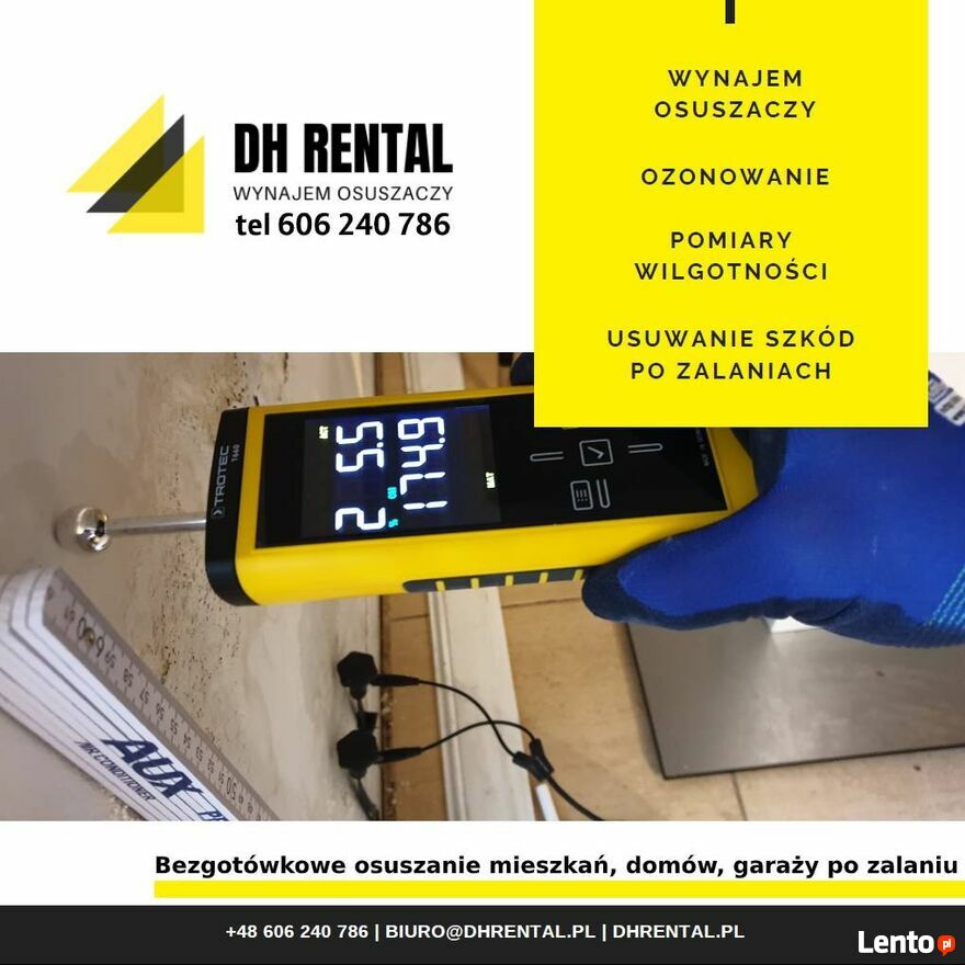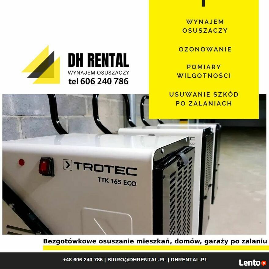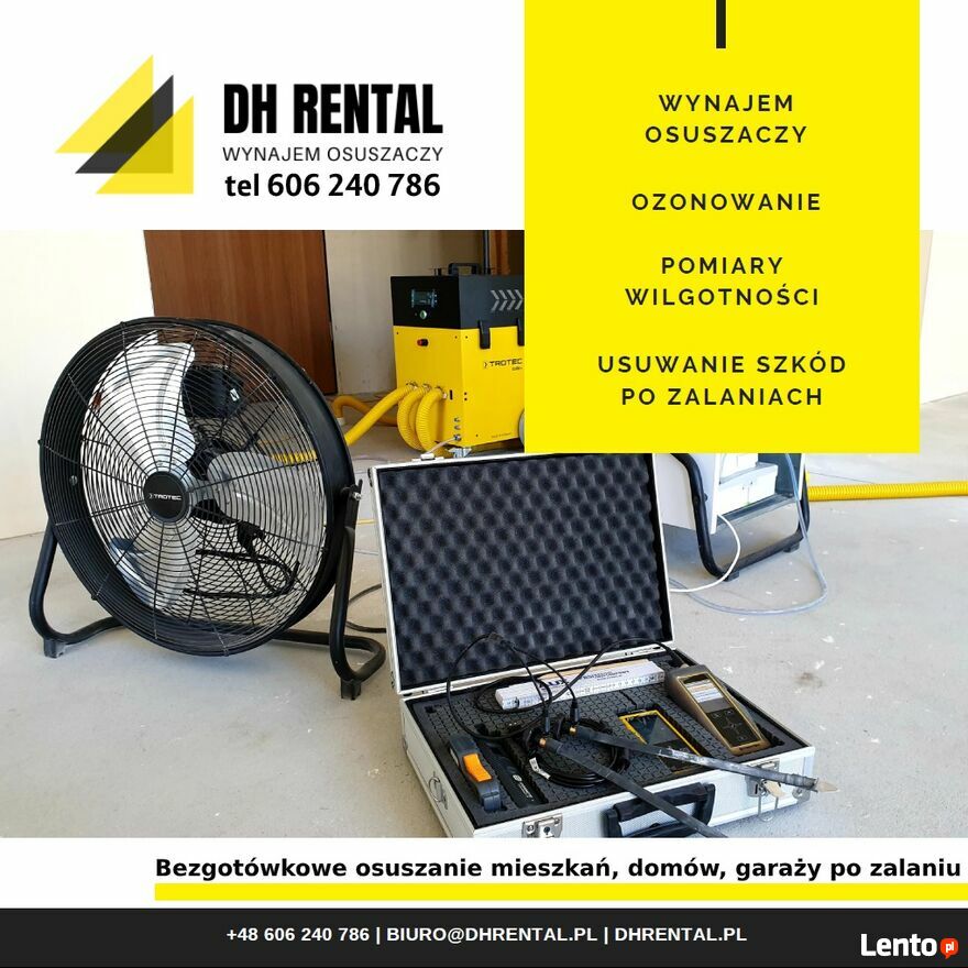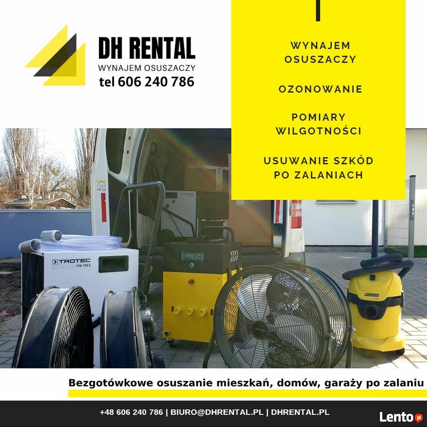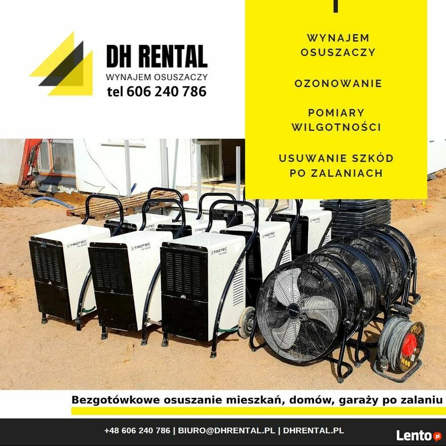Oferujemy wynajem profesjonalnych urządzeń do osuszania, pochłaniaczy wilgoci.Osuszymy: mieszkanie, dom, garaż, komórkę lokatorską, piwnicę, halę, biuro, magazyn i wszelkie inne pomieszczenia, które uległy zalaniu lub potrzebują osuszania podczas prac remontowo-budowlanych. Suszenie tynków i posadzek przed malowaniem, kładzeniem płytek czy drewnianej podłogi. Zapewniamy wydajny sprzęt, dowieziemy i odbierzemy osuszacze. Zmierzymy wilgotność.