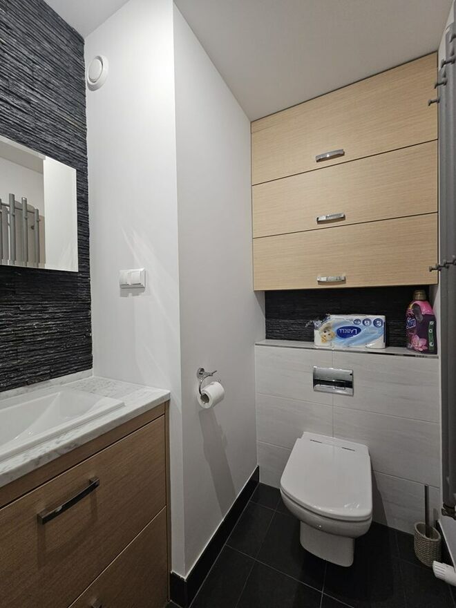 Łazienka: kabina prysznicowa, pralka, meble łazienkowe.