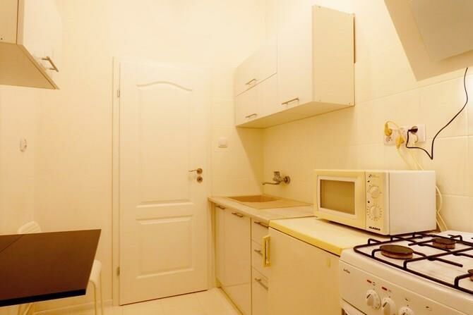 zlewozmywak., stolik z dwoma krzesłami, mikrofalówka.