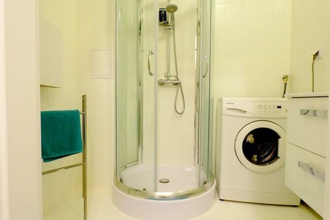 Łazienka: lustro z półką, kabina prysznicowa, pralka.