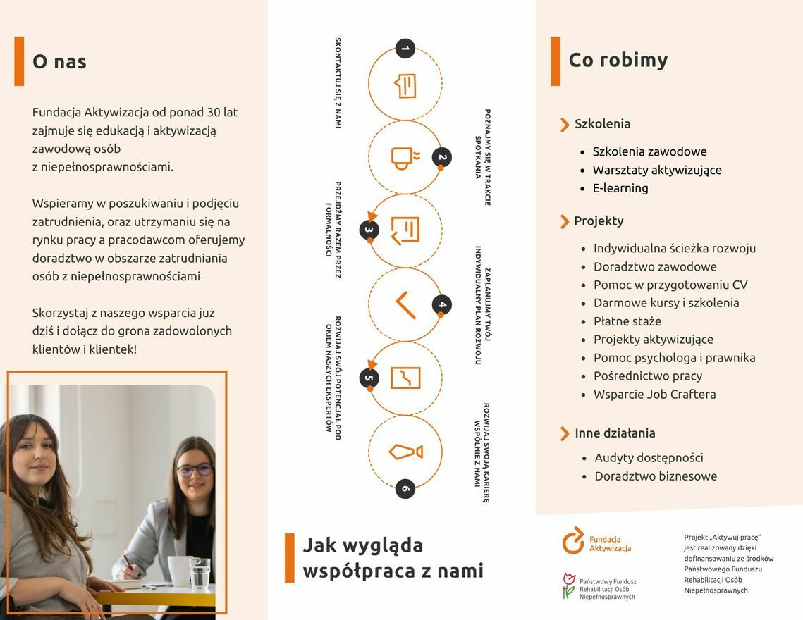 Fundacja Aktywizacja prowadzi projekty z zakresu aktywizacji zawodowej dla osób z niepełnosprawnościami. Obecnie poszukujemy osób, które pomogą nam bezpłatnie w PRACY W BIURZE FUNDACJI we Wrocławiu (ul. Grabiszyńska 167).