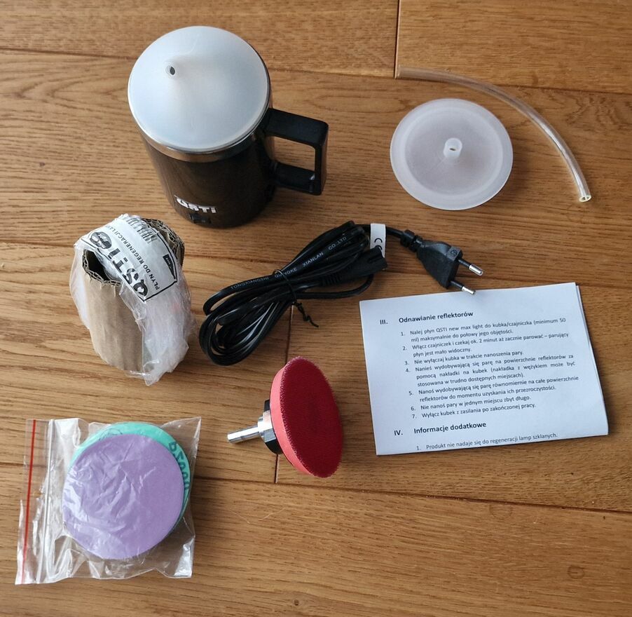 QSTI Bright LampZestaw zawiera: czajniczek + płyn 100 ml + dysk mocujący + krążki ścierne na rzep (8 sztuk).