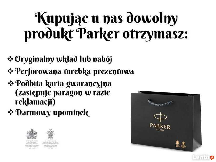 Wybrane modele długopisów i piór wiecznych Parker można grawerować. Podana cena pióra/długopisu nie zawiera usługi grawerowania. Szczegółowe informacje oraz ceny za grawerowanie oraz dodatkowe tabliczki grawerowane dostępne są w naszym sklepie internetowym Parker-Shop.pl